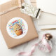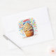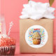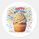 Round sticker is shown with a cute cupcake birthday confetti print.