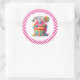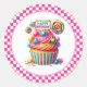 Round sticker is shown with a cute cupcake birthday candy treats print.
