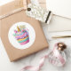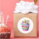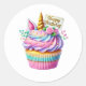 Round sticker is shown with a cute cupcake birthday unicorn print.
