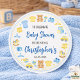 Cute boy baby shower sticker with baby clothes and toys theme. Perfect for baby shower favors, invitations, and party decorations.