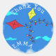 Cute Kites en los niños del cielo Gracias Nombre Pegatina redondo clásico. Este pegatina viene con cometas, volando en el cielo, texto Gracias y un nombre. Puede personalizar el pegatina cambiando el nombre.