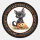 El más lindo diseño circular de dirección de devolución de gatito negro de acuarela con ojos verdes con una jack-o-lantern y calabazas a sus pies. Simplemente personalice con su nombre o apellido y dirección de devolución, ciudad, estado y código postal.