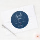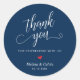 Modern Wedding Minimalist Thank You Gifts Classic favor Round Sticker, in classy script, cute little red heart, with bride and groom name and wedding date, in navy blue theme.