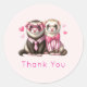 Gracias pegatinas con un lindo ilustracion. Un par de nutrias con ropa rosada. Vestidos de camisetas a rayas, uno con corbata y el otro con un arco. Rodeado de corazones de amor.