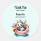 Cumpleaños gracias pegatinas con una adorable imagen veraniega. Un diseño acuático con un panda blanco y negro sentado en una junta de natación en el agua. Rodeado de flores silvestres de bonito. Un oso totalmente frío.