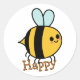 Una abeja personalizado adorable y caprichosa con rayas negras y amarillas, alas azules, mejillas rosadas y una sonrisa feliz. Lleva la palabra feliz, que está en un texto de color naranja con un contorno punteado.