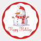 Un caprichoso muñeco de nieve lleva su gorra de Papá Noel, y una bufanda de rayas rojas y doradas. Tiene la nariz de zanahoria, una gran sonrisa y las manos pegadas. Felices fiestas es la redacción de un guión rojo festivo debajo, en un fondo blanco. Un borde de vieiras circular en rojo Navidades coincidentes proporciona el borde de este pegatina de etiquetas redondeadas. Sencillo, clásico y divertido para la temporada.