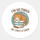 This adorable sticker features a cozy orange tabby cat snoozing in a striped coffee cup, surrounded by twinkling stars and warm vintage tones. Perfect for anyone who loves cats, coffee, or naps! With the funny phrase “I’m So Tired, My Tired Is Tired,” this design captures the ultimate mood for sleepy mornings and late-night study sessions.