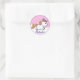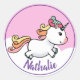 Pastel pegatina con nombre, con un lindo unicornio gordo en una nube.
