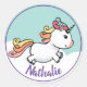 Pastel pegatina con nombre, con un lindo unicornio gordo en una nube.