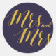 Un pegatina boda rústico de moda, presenta a la "Sra. y la Sra." con letras de guiones de color dorado sobre fondo azul cobalto.