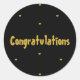 Celebre momentos especiales con esta elegante pegatina redonda de "Felicidades" en negro y dorado. Perfecta para graduaciones, ascensos, bodas y logros, este diseño elegante añade un toque de clase a regalos, sobres, detalles de fiesta y más. La fuente de pincelada dorada en un fondo oscuro la convierte en una excelente opción para cualquier celebración.