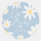 Esta pegatina redonda es parte de la colección de baby shower Floral Daisy caracterizada por un estilo retro con flores de margarita de acuarela y color azul polvoriento que es perfecto para una fiesta de baby shower de niño. Con innumerables opciones de personalización, esta plantilla es fácilmente personalizable para todos los eventos y fácil de combinar con sus colores.