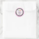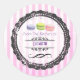 Un dulce gracias pegatina que dice: desde la cocina de. Personaliza con un nombre. 3 adorables macarones acuáticos en tonos rosa, lima y violeta. Está situado sobre un marco circular de estilo grunge elegante. El fondo es un fondo de rayas rosas que tiene un aspecto angustiado.