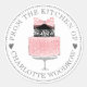 Hermoso pastel de capa rosa en acuarela con etiquetas redondas de productos horneados con "de la cocina de", con tipografía clásica decorativa abierta. Solo agrega tu nombre. Un estilo llamativo para tus productos horneados. Puedes usar la herramienta de diseño simple para cambiar el estilo y color de las fuentes.