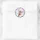 Envuelva su correo o regalo de vacaciones con un bonito sello redondo que presenta los bordes de un sobre de correo aéreo en azul oscuro y rojo. Tiene una ilustración de Rudolph el reno con una bufanda acogedora y un sombrero de invierno. La oficina de correos del Polo Norte utiliza correo aéreo todo el tiempo porque todo el correo de Navidad debe llegar a tiempo. El texto personalizable dice POLO NORTE - OFICINA DE CORREOS - CORREO AÉREO