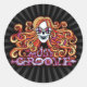 Calavera gruesa de pelo largo, con gafas de señas de paz y "Must Groove" con letras groovy. Camisetas, huellas, novedades, regalos.