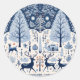 Un bonito ilustracion de un paisaje boscoso con ciervos, árboles y animales en una paleta de color azul, obras de arte inspiradas en Escandinavia, motivos folclóricos detallados, motivos nórdicos tradicionales y una casa rústica de madera visible en el fondo. Se forma un borde decorativo alrededor de todos los elementos. El diseño incluye elementos como corderos de venados, flores silvestres, hojas, luciérnagas, estrellas y huellas de animales. ¡Un bonito diseño para todas las festividades de tus Navidades!
