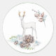 pegatinas redondos con temática navidad, con hermosas acuarelas de ciervo blanco y follaje de invierno y campanas de suaves colores pastel.