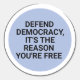 Los acontecimientos en todo el mundo muestran continuamente que la democracia nunca se debe dar por sentada y que se debe defender constantemente, si valoramos nuestra libertad, porque una vez que la democracia cae, es difícil recuperarse, si es que alguna vez lo hacemos. Este pegatina redondo presenta un diseño azul claro sencillo pero elegante para difundir el mensaje. El texto y el círculo azul se pueden personalizar a su gusto.
