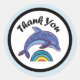 Un pegatina de agradecimiento con un lindo ilustracion de un delfín azul saltando y arqueando sobre un arco iris caprichoso.