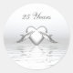 Pegatinas redondas con mi obra de arte de dos delfines y un corazón de plata en aguas brillantes. El texto personalizable dice "25 Años".