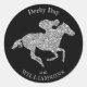 Los pegatinas redondos cuentan con un falso purpurina plateado, caballo de carreras y jockey sobre cualquier fondo de color - mostramos negro. Una forma divertida de vestir tus favores de fiesta, decoración fiesta, mesa, invitaciones y más. Utilícelo para un fiesta Derby, un fiesta de ducha de novia Derby, una fiesta de cumpleaños o cualquier ocasión. COINCIDIENDO elementos de nuestra colección.