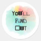 Este diseño presenta la frase "Lo descubrirás" presentada en una fuente moderna y estilizada con tipografía variable. La palabra "lo harás" se divide en "YoU'L..." con una puntos suspensivos, lo que da un sentido de suspenso o intriga. La palabra "ENCONTRAR" incorpora un diseño único donde algunas letras incluyen formas o cortes, como una palmera dentro de la "I". El texto está recubierto de una suave tonalidad acuarela de tonos pastel que mezcla el amarillo, el rosa, el verde azulado y el azul. El fondo crea una estética tranquila pero creativa, que contrasta suavemente con el texto negrita y negro y añade un toque de sofisticación artística.