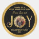 Sencilla Relieve metalizado falso, elegante y sobria foto familiar "Te deseo una temporada de vacaciones llena de paz, amor y alegría" diseño de cortina con diseño de vacaciones de Navidades fotográficos circulares del centro. Anillo exterior, letras "J" e "Y" en "Alegría", y las hojas que rodean la foto son falsos Relieves metalizados. El texto superior e inferior es de color dorado (pero no falso Relieve metalizado). Estos hacen grandes adornos durante las vacaciones y regalos a los abuelos, a otras familias y amigos.