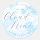 Una elegante y caprichosa pegatina de despedida de soltera con nubes en acuarela en colores pastel azules que incluye un texto en caligrafía que dice "ella está en la nube nueve".