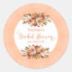 Con flores de acuarela de melocotón boho rústicas y un borde de filigrana de encaje, estas hermosas pegatinas redondas clásicas de despedida de soltera floral se pueden personalizar con el nombre de la novia y la fecha de su despedida.