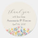 Agregue un dulce toque final a sus detalles de compromiso con esta encantadora etiqueta de agradecimiento. Diseñada con flores silvestres de acuarela en tonos alegres de jardín, esta etiqueta redonda presenta fuentes elegantes de escritura y serif, personalizadas con los nombres de la pareja y la fecha. Perfecta para sellar bolsas de detalles, cajas o sobres en celebraciones de compromiso de primavera o al aire libre. Una hermosa manera de compartir su gratitud con los invitados en estilo floral.