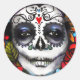 Vibrante Día de la Muerte floral sobre su elección de calcomanía brillante o mate. Flores adornadas con joyas ricas rodean la cara de una mujer pintada para el Día de los Muertos en México. Tómate tiempo para oler a los rosas...