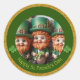 Miniatura Leprechaun en 3D + "Feliz Día de San Patricio" en un círculo verde. Diseño en pegatina redondo.