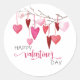 Esta divertida pegatina de vacaciones presenta una rama con corazones colgantes en tonos rosados con el texto "Feliz Día de San Valentín".
