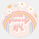 ¡Un Chica Groovy! Pegatinas de 1er cumpleaños inspirados en el retro con fuentes y colores de estilo 70, arcoiris y margaritas.