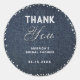 Una plantilla de etiqueta de agradecimiento simple, moderna y elegante para una ducha nupcial, almuerzo o fiesta, que presenta un fondo de jeans, la palabra TU cubierta de diamantes blancos (simulados, no diamantes reales) y en escritura de caligrafía moderna, y tipografía en blanco. Un diseño chic de "jeans y diamantes" para una novia moderna.