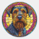 Retrato de un perro con una barba espesa y pesada y ojos expresivos, enmarcado por un vibrante fondo de vidrio teñido en tonos amarillos, rosas y azules.