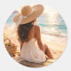 Un momento tranquilo en la playa se desarrolla cuando una niña de piel oscura se sienta con gracia en un banco de madera, absorbiendo el calor del sol brillante. Su sombrero de ala ancha proyecta una suave sombra, añadiendo un encanto elegante mientras la luz dorada baila a través de las olas suaves.