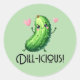A delightful cartoon-style illustration of a Kaiwi pickle, beaming with a bright, happy smile and paired with the playful pun “Dill-icious.” This irresistibly cute veggie is bound to capture hearts and charm audiences everywhere.