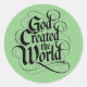 Un ilustracion de la frase "Dios creó el mundo" escrito en un delgado y refinado tipo de escritura formal con florecientes. El texto consiste únicamente en contornos finos sobre un fondo blanco. El guión tiene algunas curvas y elementos decorativos, como un desplazamiento y un florecimiento al final de la frase.