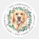Añada el toque final a sus tarjetas de vacaciones esta temporada de vacaciones con este elegante recuperador dorado en un navidad de diseño de corona que devuelve etiquetas de dirección y decoración que coincide. Esta etiqueta de la dirección de retorno vacacional de los recuperadores dorados incluye un perro acuarela en una corona verde y roja con bayas y heces. Esta etiqueta de la dirección de retorno de los recuperadores dorados será la favorita entre los amantes de los recuperadores de oro, los amantes de los perros y los amantes de los animales. Visite nuestra colección para ver tarjetas de navidades de recuperación dorada, decoración y regalos. DERECHOS RESERVADOS © 2020 Judy Burrows, Black Dog Art - Todos los derechos reservados. Navidades de perro de Golden Retriever Retorno Dirección Pegatina redondo clásico