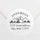 Etiquetas de direcciones redondeadas diseñadas por personalizados que incluyen cabañas de montaña y bosques de estilo manual con nombre y dirección familiares personalizados.
