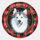Un hermoso retrato de un perro malamute está en el centro de este pegatina de regreso. La imagen se coloca sobre un fondo de manto de pintura roja brillante y se enmarca en verde Navidad. El texto en blanco tiene tu nombre y dirección en un borde rojo y negro de círculo de búfalo trenzado.