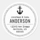 Este pequeño pegatina redondo ofrece un borde de cuerda náutica blanco y negro acentuado con un ancla de barco. El texto personalizado le permite agregar su nombre y la dirección de retorno.