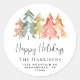 Sencillo y elegante dirección de retorno pegatinas para la correspondencia de sus Navidades con un resumen acuarela de pinos en verde sabio mutado, rojo, dorado y naranja y "Felices Fiestas" en un guión elegante.