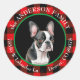 Un adorable Boston Terrier con un sombrero de Santa rayas rojas y blancas está en el centro de este lindo pegatina de regreso. La imagen se coloca sobre un fondo de manto de pintura roja brillante y se enmarca en verde Navidad. El texto en blanco tiene tu nombre y dirección en un borde rojo y negro de círculo de búfalo trenzado. Perfecto para tarjetas de Navidad y correspondencia.
