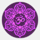Un diseño de aluminio u Om se encuentra dentro de una flor de loto estilizada. El patrón circular está coloreado con un violeta profundo que se resalta para crear un brillo luminoso en la superficie. El fondo está pintado de púrpura oscuro que se puede ver a través del espacio negativo de la flor. Una sombra aparece justo debajo del diseño haciendo que parezca flotar justo encima de la superficie del pegatina. Este diseño elegante es una impresionante representación de este símbolo espiritual.