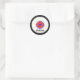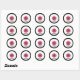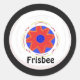 Un pegatina divertido con una frisbee blanca con diseños azules y rojos. El dicho "frisbee" se puede cambiar o eliminar.