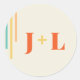 Añada un toque personal a los detalles de su boda con nuestros pegatinas de moda retro. Con un fondo amarillo claro con tres rayas vibrantes en verde azulado, amarillo y naranja, estos pegatinas muestran las iniciales de la pareja en naranja separadas por un amarillo negrita "+". Perfecto para sellar sobres, decorar favores o añadir un elemento único a su papelería boda, estos pegatinas le aportan un toque moderno pero nostálgico a su celebración.